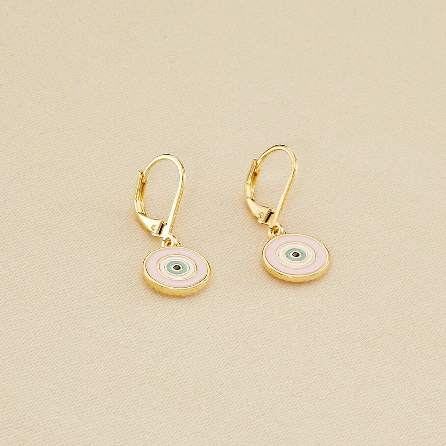 Boucles d’oreilles dormeuses, en laiton doré à l’or fin, avec un œil turc émaillé centré d’un oxyde de zirconium