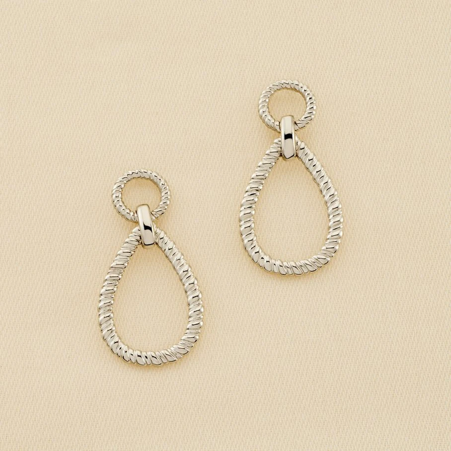 Boucles d’oreilles mi-longues, en argent véritable, dont le top est un anneau évidé torsadé au bout duquel est suspendu une goutte évidée et torsadée