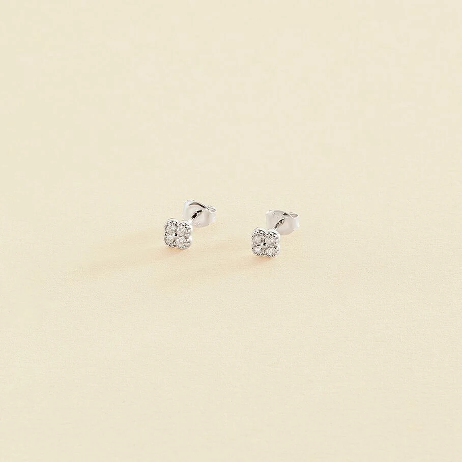 Boucles d’oreilles puces, en argent véritable, en forme de fleur dont les pétales sont pavés d’oxyde de zirconium et le pourtour réalisé avec un fin graineti