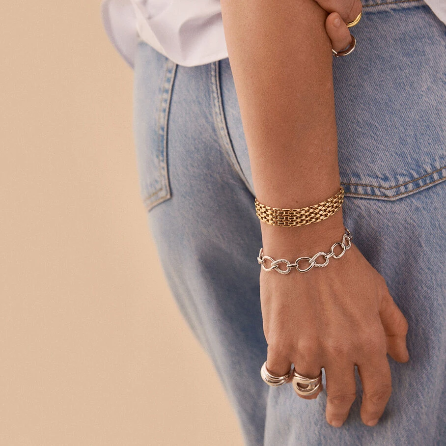 Bracelet, en argent véritable, réalisé avec une maille en forme de gouttes. L’alternance de maillons lisses et torsadés ainsi que le fermoir barette, identitaire à la marque, confère une vraie personnalité à ce bijou