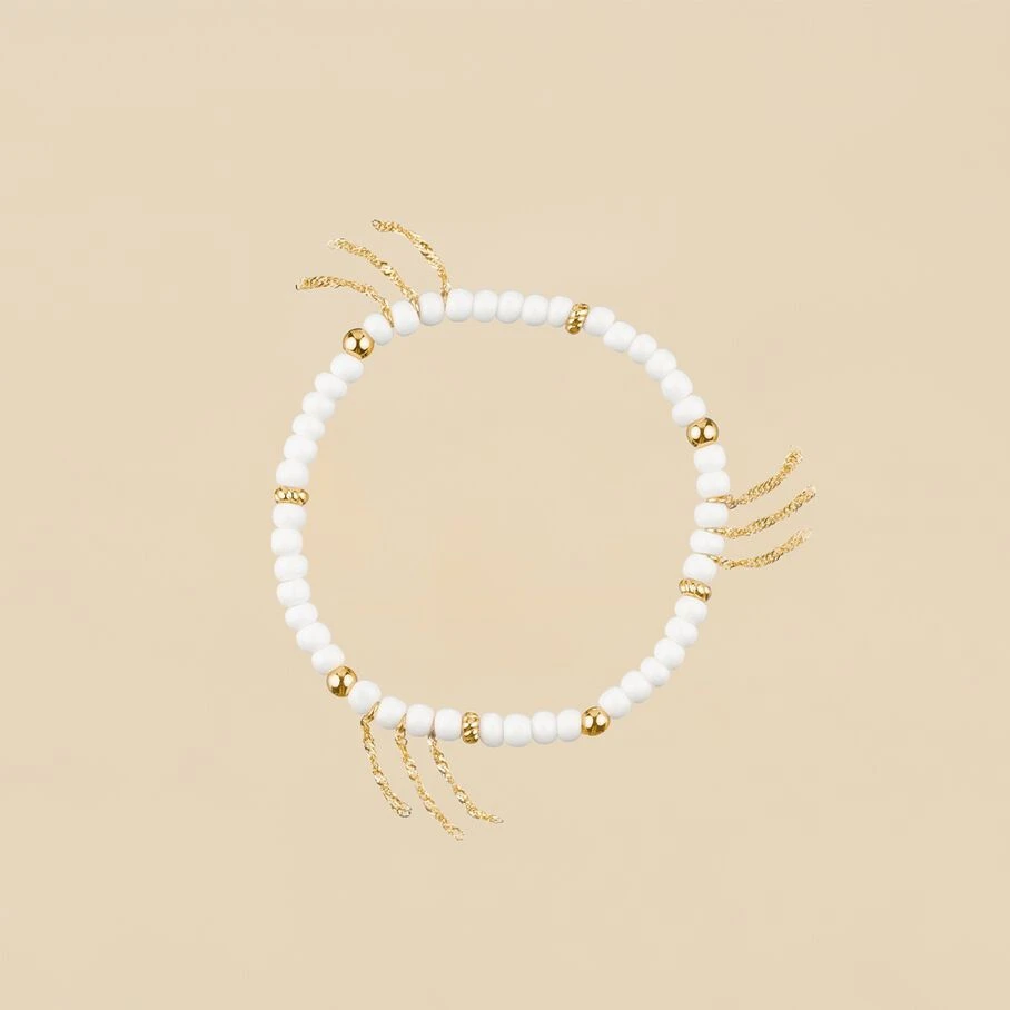 Bracelet elastique, en laiton doré 750/1000, perles de verre enfilées et pompons de chaines