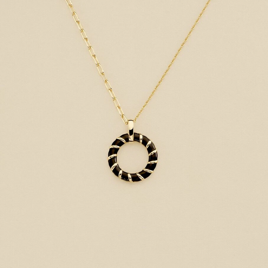 Collier mi long, en laiton doré, chaine torsade et rectangle, pendentif anneau avec un effet torsadé en émail