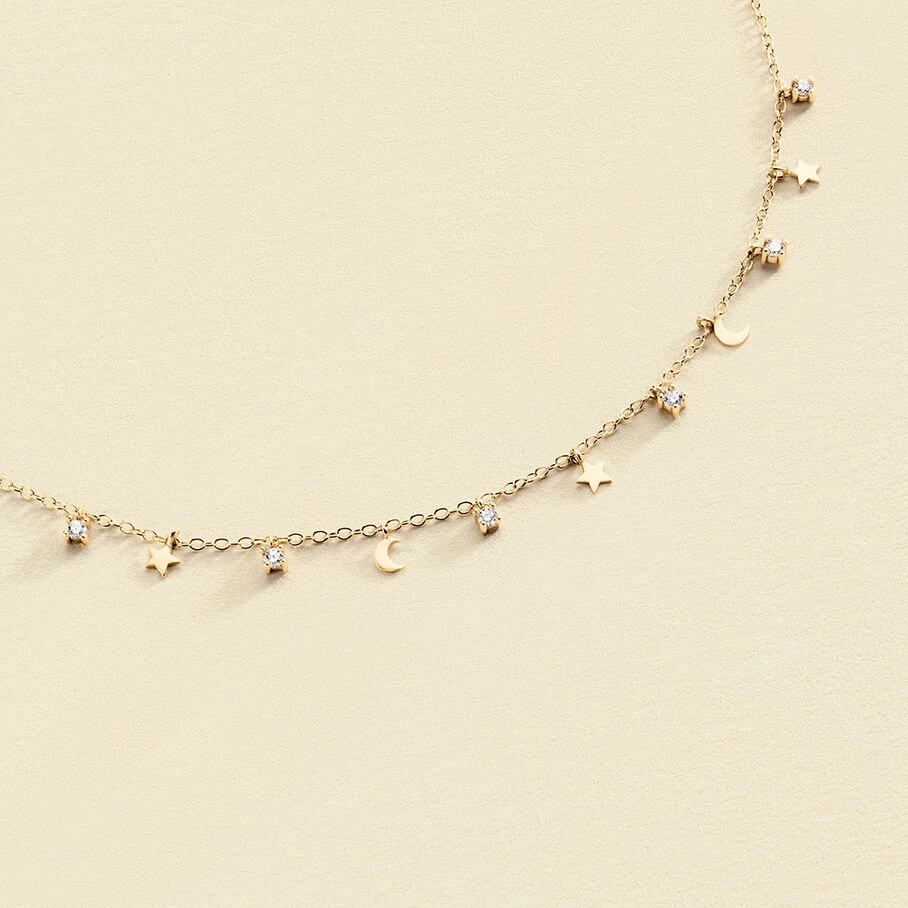Collier, en argent véritable doré 750/1000, avec des mini pampilles lunes et étoiles