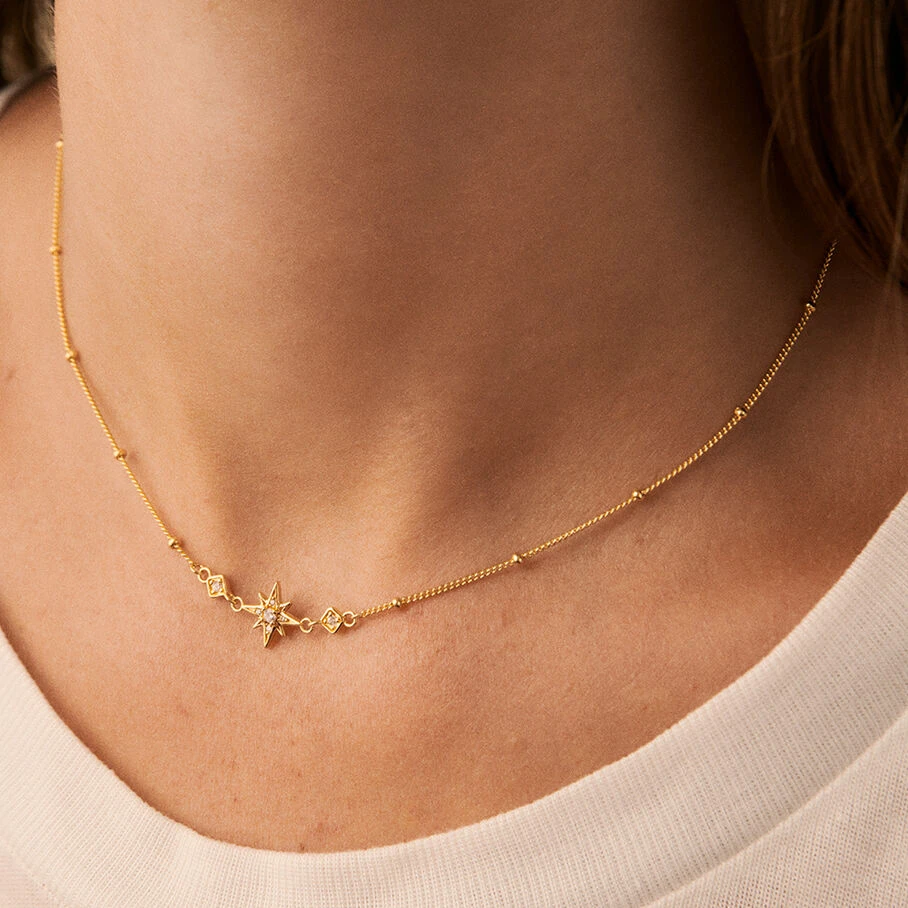 Collier mi-long, en argent véritable doré 750/1000, avec une étoile en pendentif serti d’un oxyde de zirconium sur une fine chaine