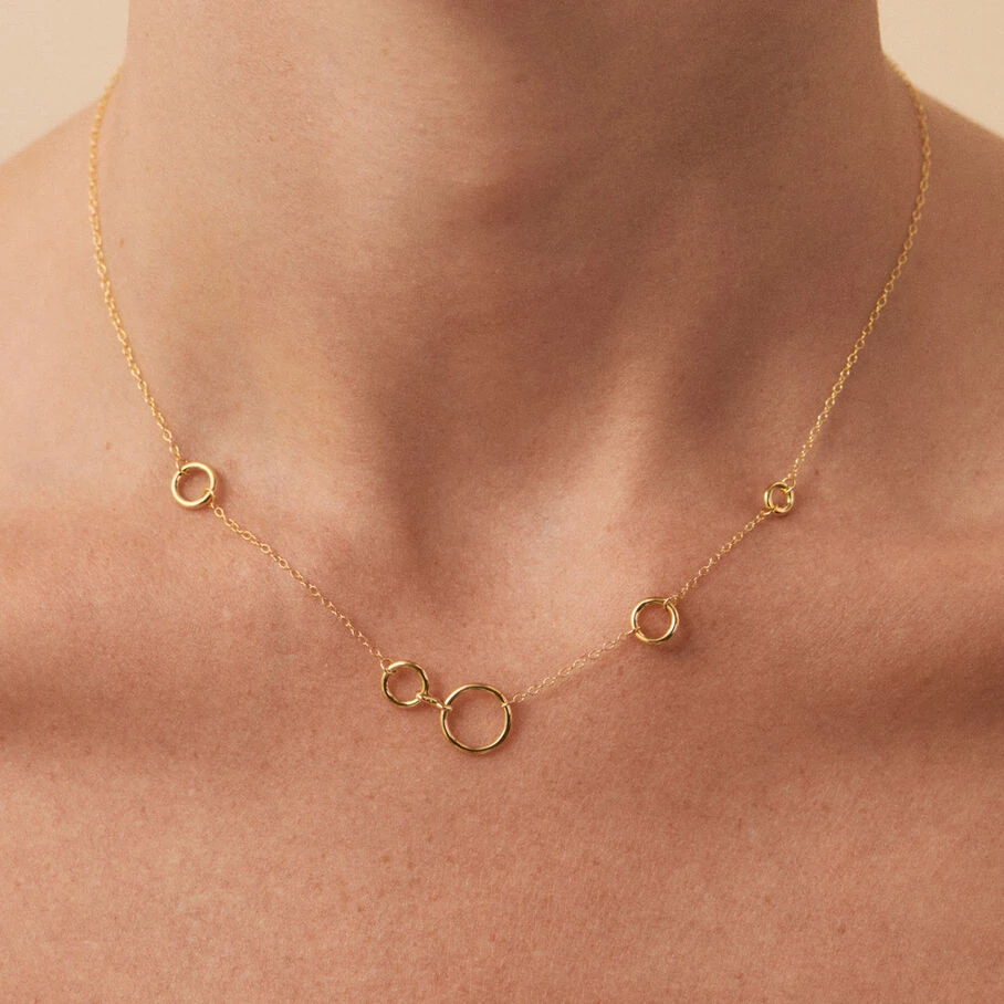 Collier court, en argent véritable doré 750/1000, avec une fine chaîne sur laquelle sont montés des anneaux évidés de différentes tailles
