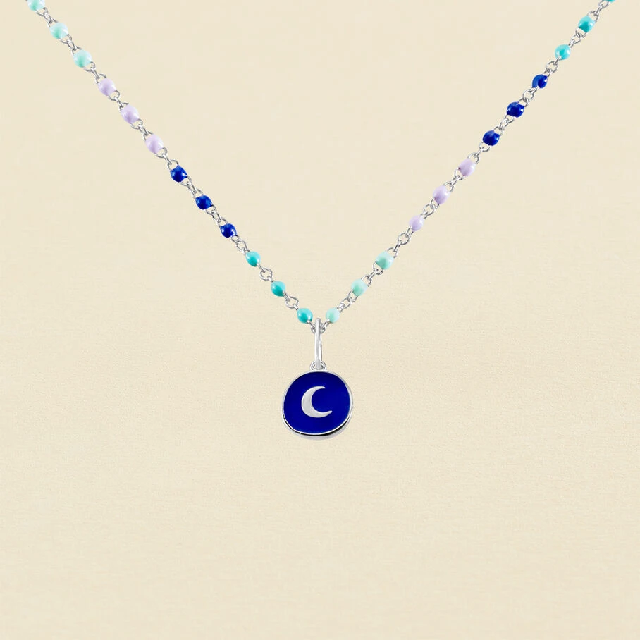 Collier court, en laiton rhodié, perles d’émail sur toute la longueur et médaille double face en pendentif