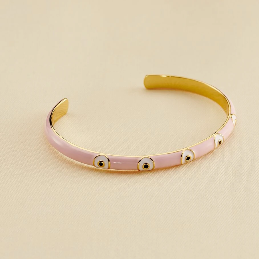 Jonc fin ouvert, en laiton doré à l’or fin, émaillé avec comme motif des yeux turcs avec un oxyde bleu marine au centre de chaque œil