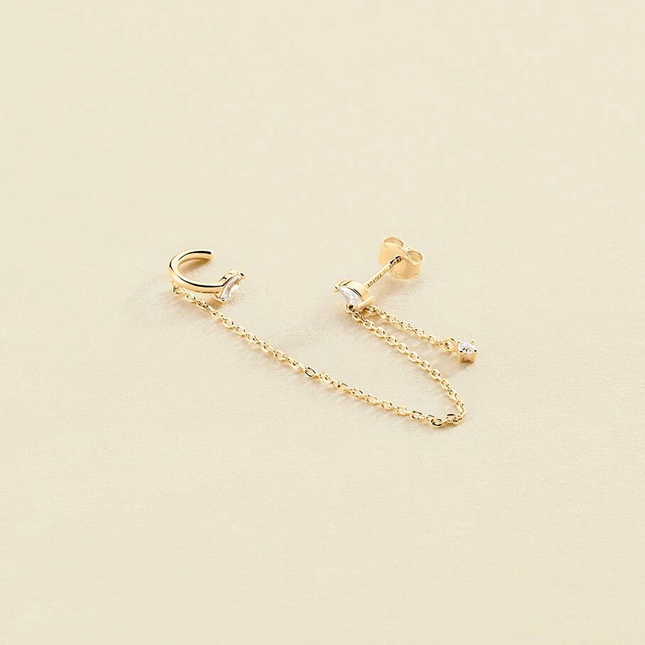 Earcuff, en argent doré 750/1000, chaine qui relie un oxyde de zirconium navette en puce à un anneau faux piercing avec un oxyde de zirconium navette dessus. A l’unité.