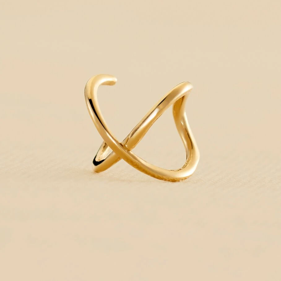 Faux piercing en argent doré à l’or fin, bague d’oreille en fils croisés. A l’unité, pour mieux les mixer et les accumuler.