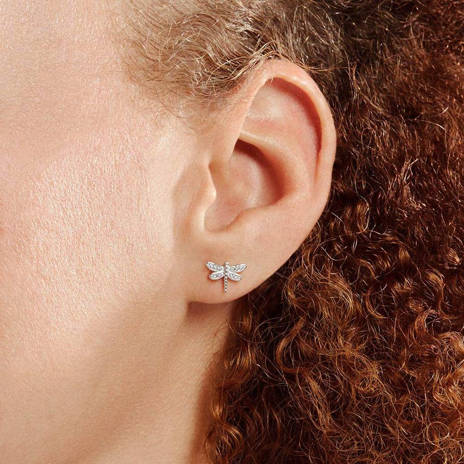 Boucle d’oreille puce en argent véritable en forme de libellule pavée d’oxydes de zirconium. A l’unité, pour mieux les mixer et les accumuler.