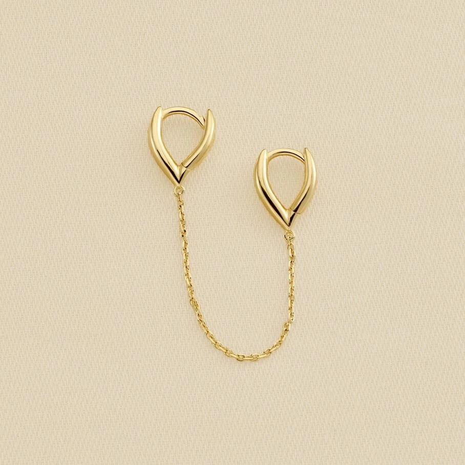 Boucle d’oreille double puces à l’unité, en argent 925/1000 et dorées 750/1000, représentant deux goutte inversée. Les deux créoles sont reliées par une délicate chaine de la même matière.