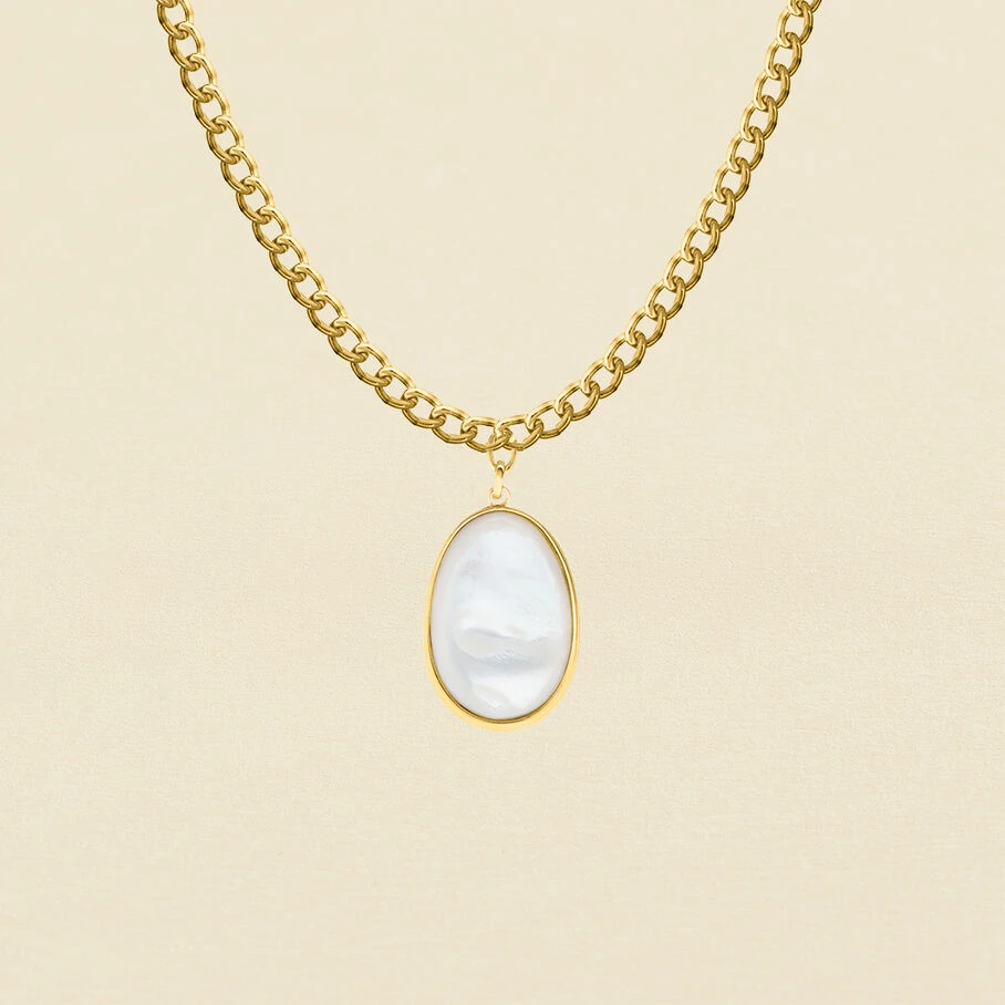 Collier long en laiton doré 750/1000 formé d’une chaîne rectangle et d’un pendentif ovale orné de nacre