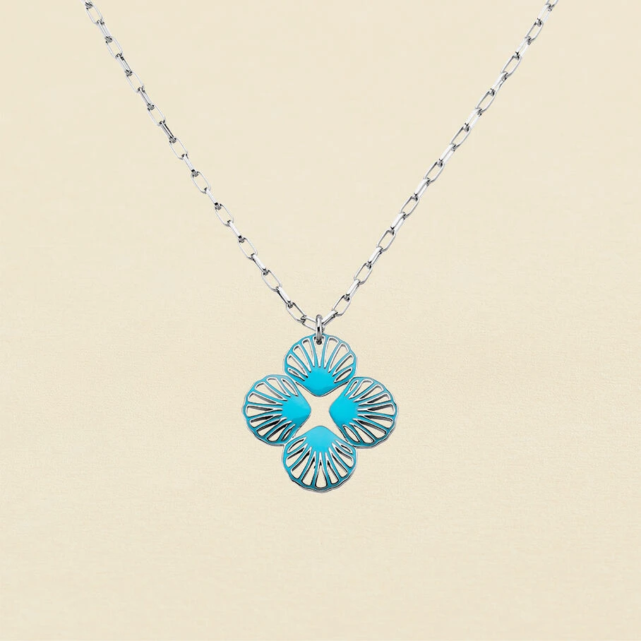 Sautoir chaîne rectangle avec un pendentif formé de quatre coquillages en trèfle. Double face: une face émaillée et une face métal.